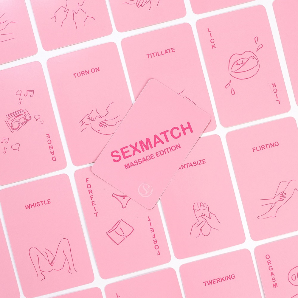 Sexmatch Massage Edition is a couples card game built around matching illustrations and words. You place a card, then your partner responds with a match. If they can’t match, they draw from the deck and lose a turn. Also, whenever you do match, you must perform the action shown. That means the game keeps moving, and the tension keeps rising.